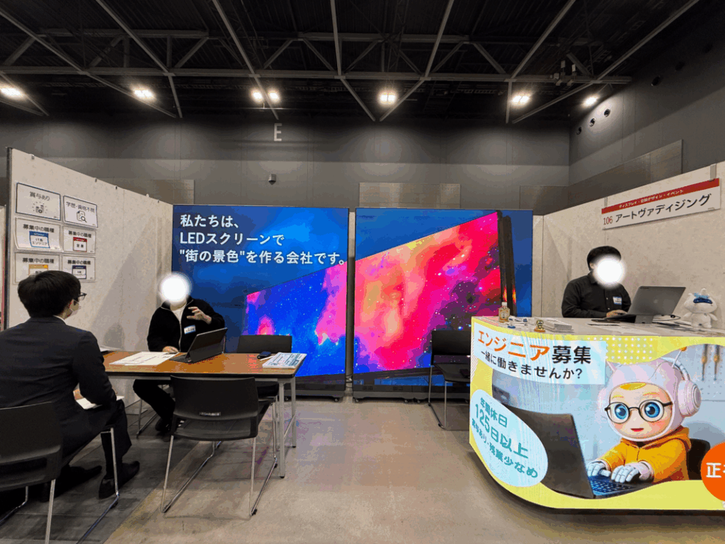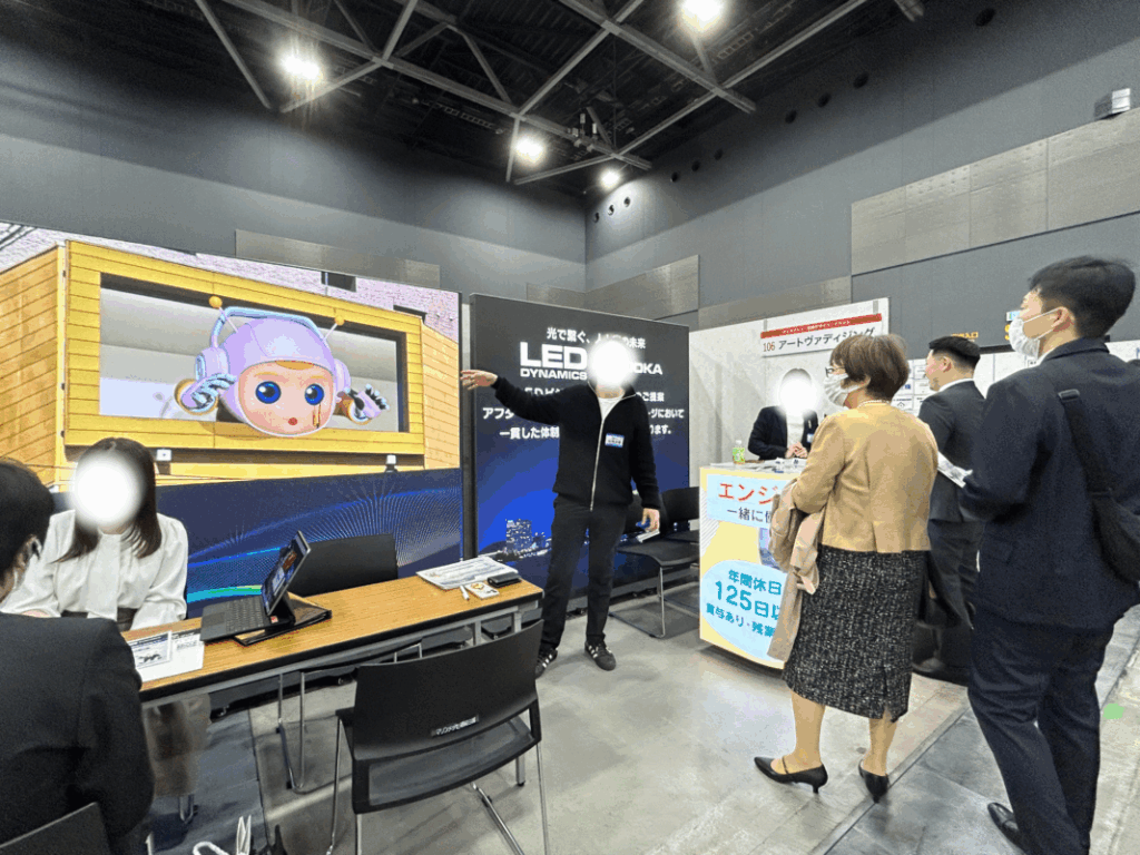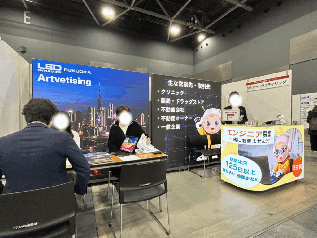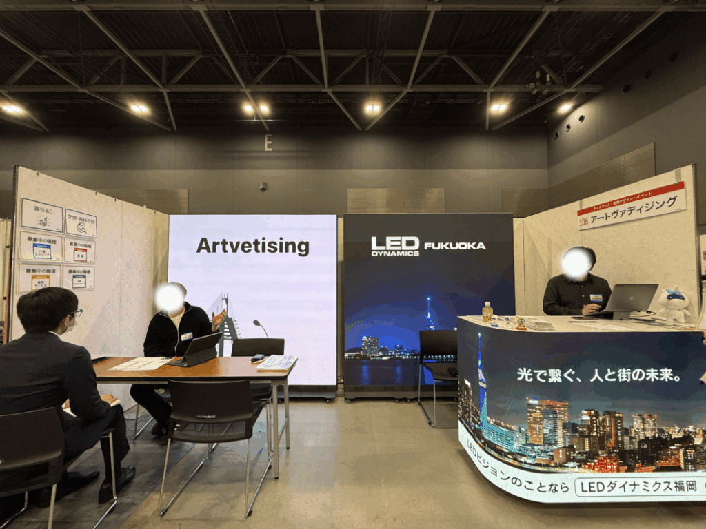 当日は、スタンド型LEDビジョンとLED付きカウンターを持ち込み、弊社ならではの“目を引くブース”を設営しました✨